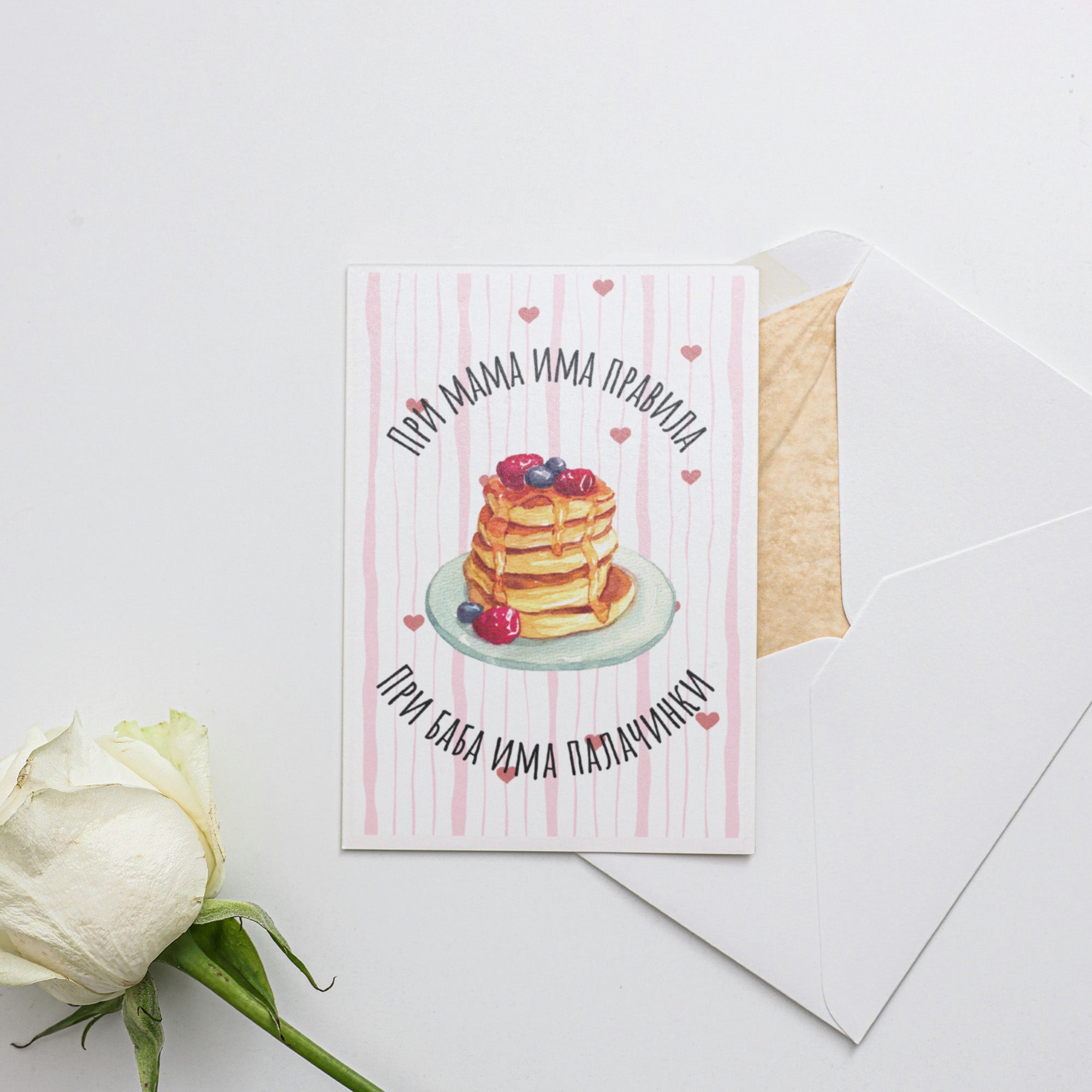 Тази забавна картичка с оригинален дизайн При мама има правила, При баба има палачинки е уникален подарък за Баба. Опитахме се да направим весели дизайни с шеговити послания за всички с чувство за хумор! Нашите картички са супер допълнение към подарък за 8 Март, рожден ден, имен ден, или друг празник!