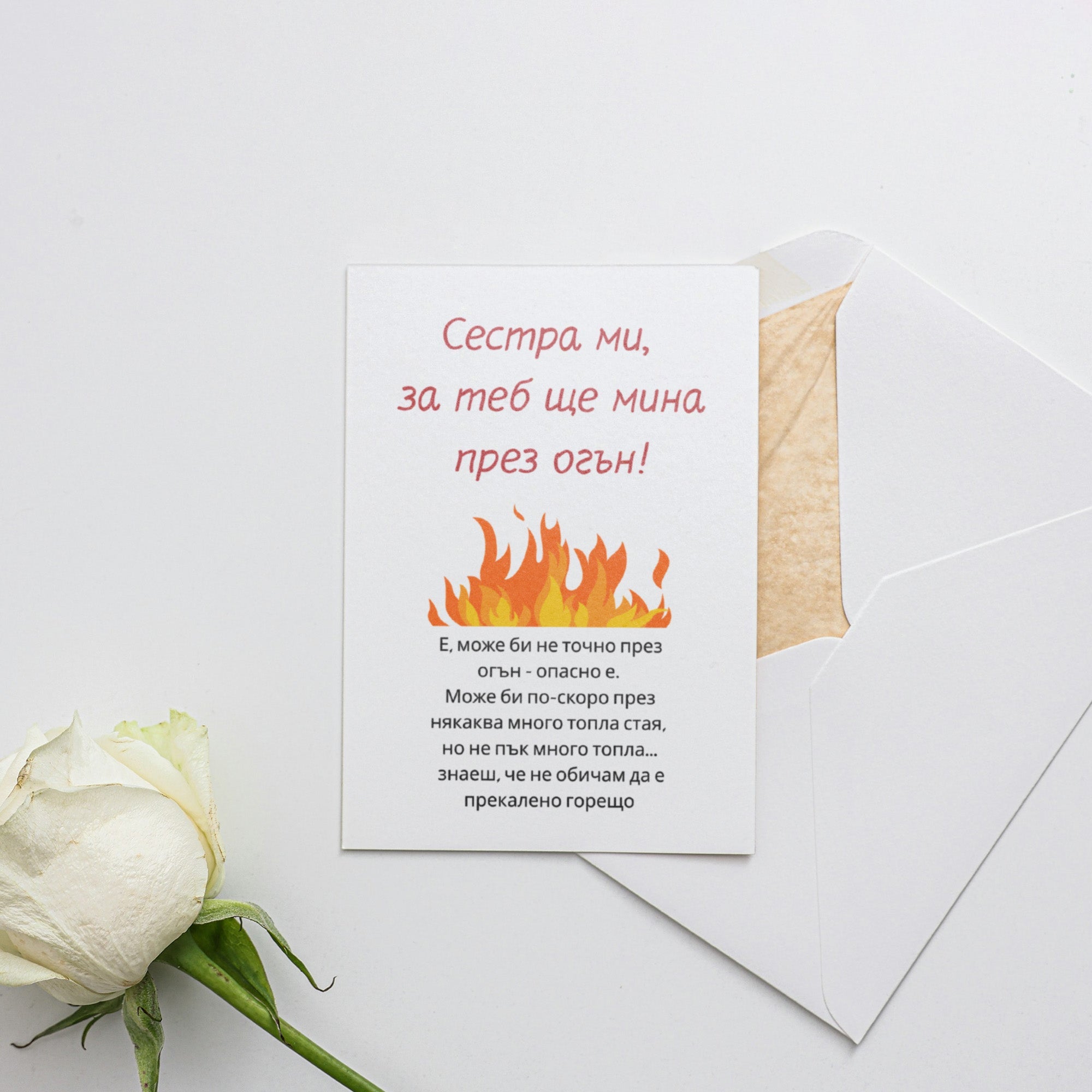Тази забавна картичка с оригинален дизайн Сестра ми, за теб ще мина през огън! е уникален подарък за Сестра. Опитахме се да направим весели дизайни с шеговити послания за всички с чувство за хумор! Нашите картички са супер допълнение към подарък за 8 Март, рожден ден, имен ден, или друг празник!