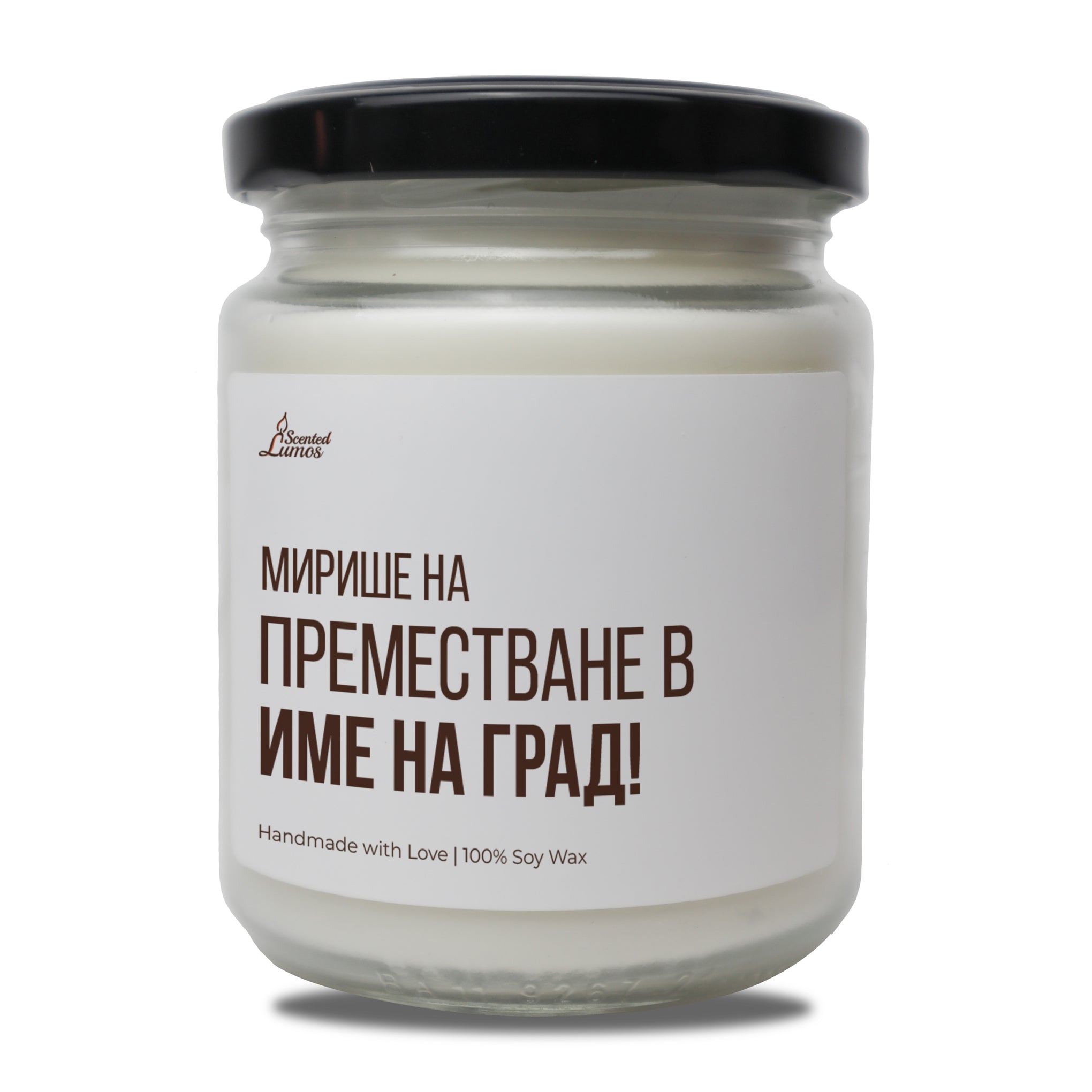 Мирише на Преместване в "Име на Град!" Персонализирана Ароматна Соева Свещ